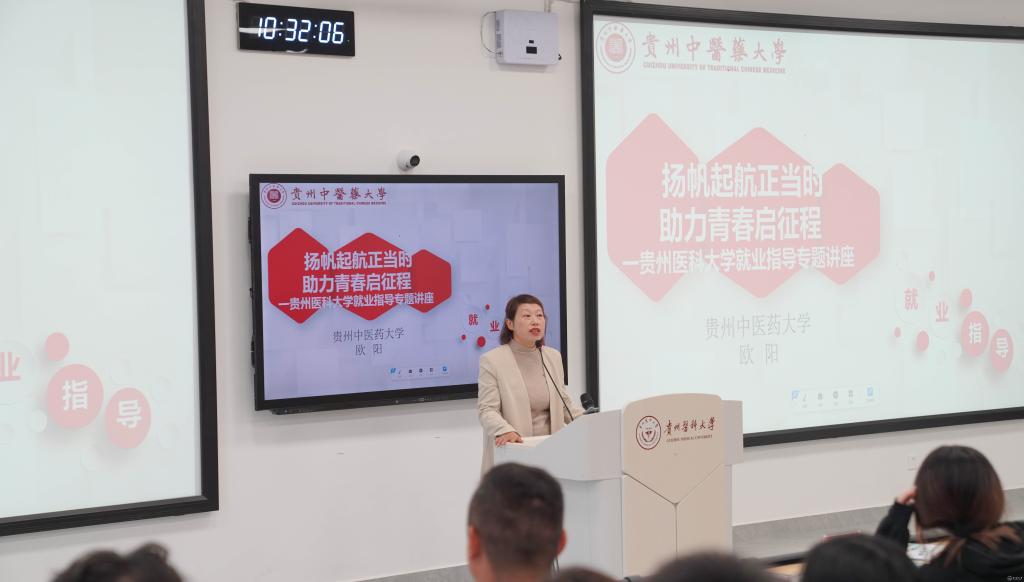 10月10日,贵阳贵安“筑人才·强省会”秋季入学季宣传推介活动在beat365云漫湖校区M103教室顺利开展。此次活动由中共贵阳市委人才工作领导小组、中共贵阳市委组织部和beat365唯一官方网站联合举办。校党委委员、副校长曾柱出席并致辞,贵阳市委人才办副主任、市人社局副局长熊斌,贵州省高校毕业生职业指导专家、贵州中医药大学第二临床医学院学生管理办公室副主任欧阳,校友代表、贵阳市南明区水口寺社区医院外科主任陶思远等相关人员参加,活动由熊斌主持。