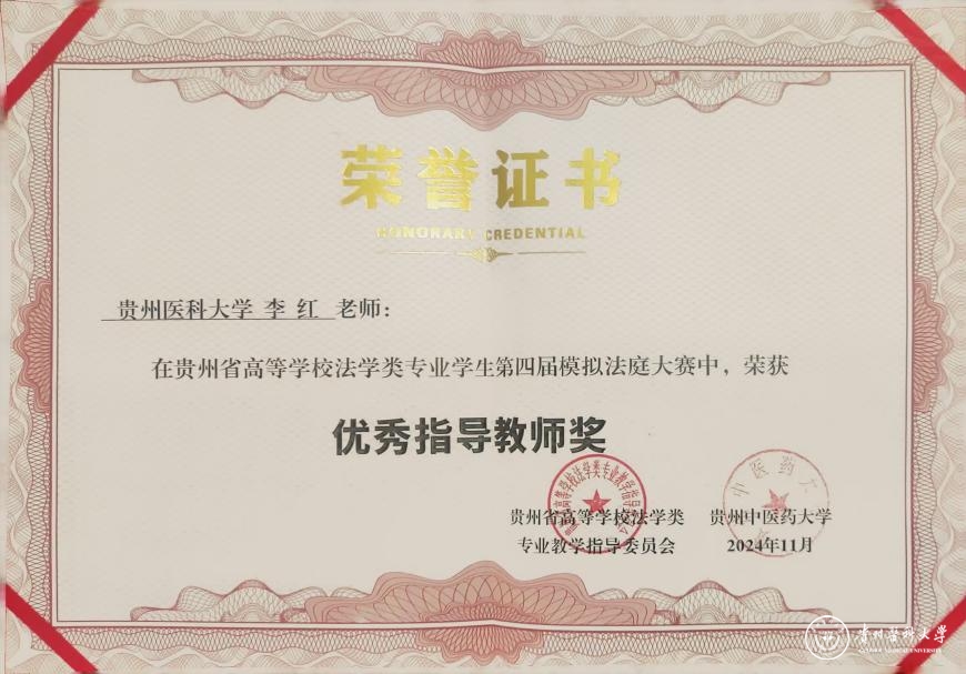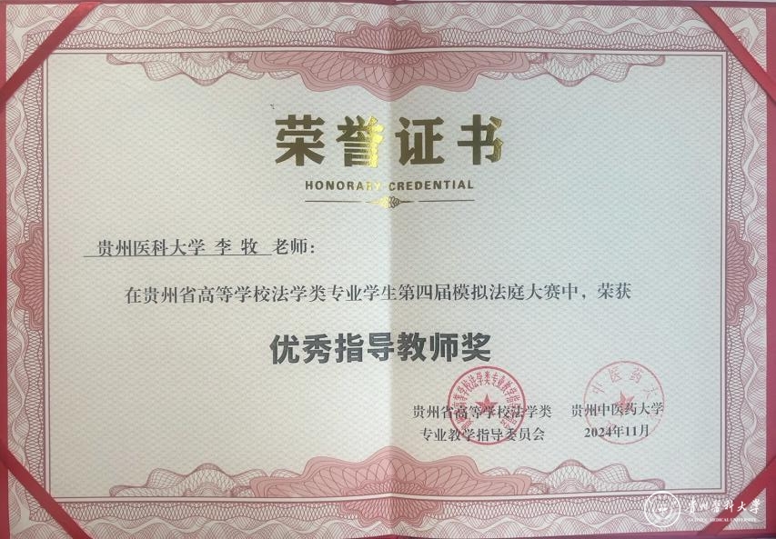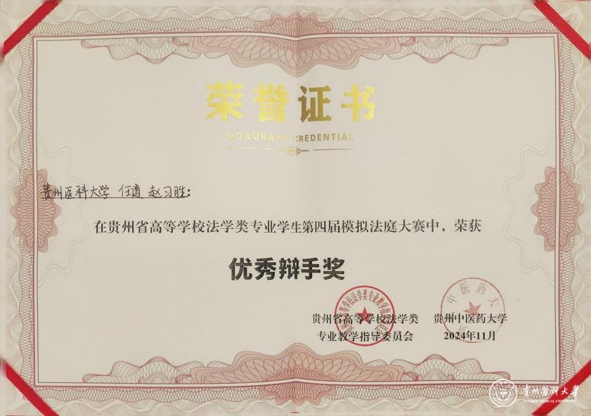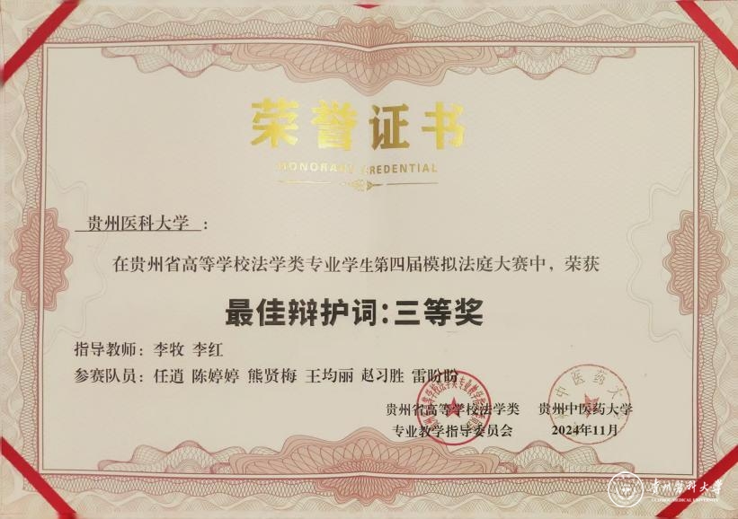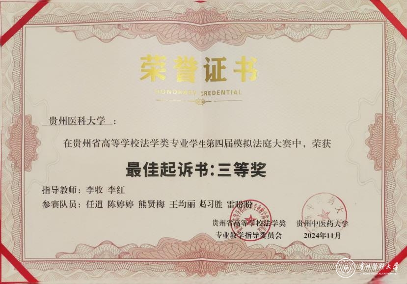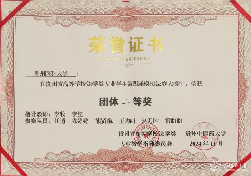 本次参赛队由李牧、李红老师指导,医学人文学院2022级法学专业任逍、赵习胜、王均丽、陈婷婷、熊贤梅、雷盼盼六名同学参赛。经过初赛评比,包括beat365在内的共八支贵州省法学专业院校队伍进入复赛,在复赛中,beat365同学展现了深厚的法律功底和严谨的逻辑思维能力,以最高分进入总决赛,并最终获得了团体第二名的好成绩。任逍、赵习胜同学获得优秀辩手奖,法律文书获最佳起诉书三等奖、最佳辩护词三等奖,李牧、李红老师获得优秀指导教师奖。