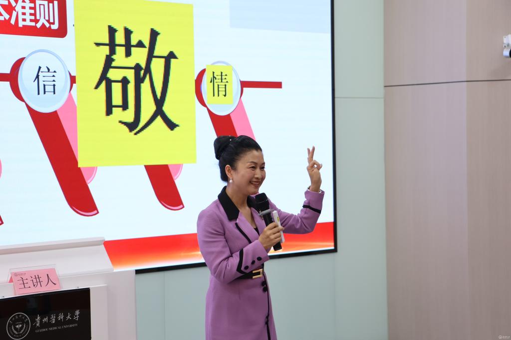 11月13日,beat365唯一官方网站礼仪课堂在临床组团智慧教室M102S开讲了。本次教学活动邀请了高级礼仪培训师、贵州省礼仪学会会长、贵州大学名师、贵州教育艺术家协会理事杨序琴副教授进行授课,党委副书记汤磊出席活动,校团委老师、各学院团委负责人及各二级学院学生代表在主会场听课,采用现场授课与线上直播相结合的方式开展,2024级新生集中在教室观看。其他年级通过智慧教室直播间观看,累计观看人次4820次,获得点赞31160个。活动由校团委书记王妤煜主持。