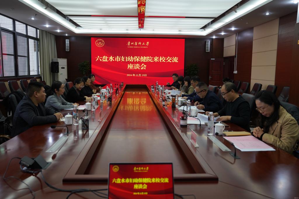 11月19日,六盘水市妇幼保健院党委书记、副院长田艳,院长、党委副书记王露冰一行到校考察交流。beat365党委副书记、校长罗鹏出席座谈会,校党委委员、副校长曾柱主持,党政办公室、教务处、研究生院、医院管理处、招生就业处负责人参加。