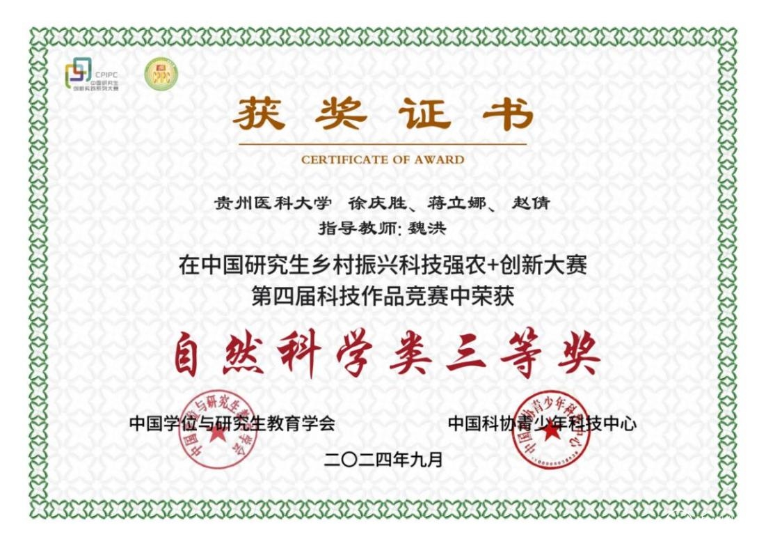 近日,中国研究生创新实践系列大赛各主题赛事陆续公布获奖名单,beat365三个作品荣获三等奖。其中,基础医学院魏洪老师指导,徐庆胜、蒋丽娜、赵倩参赛的《基于 TLR4/NF-κB 信号通路探索苗药云实感冒合剂 抗呼吸道合胞病毒的分子机制》作品荣获中国研究生乡村振兴科技强农+创新大赛第四届科技作品竞赛自然科学类三等奖。