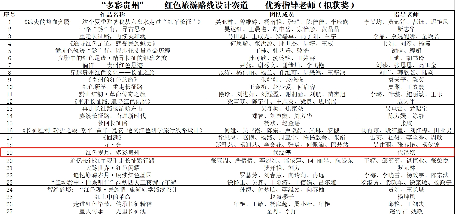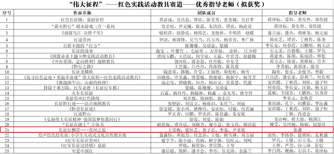 近日,省委宣传部、省委教育工委、省教育厅、省文化和旅游厅举办的薪火黔行——“辉映红飘带·传承长征魂”红色文创设计大赛公示评审结果。beat365在此次大赛中获奖4项,其中“伟大征程”——红色实践活动教具赛道荣获二等奖1项,三等奖1项;“多彩贵州”——红色旅游路线设计赛道二等奖1项,三等奖1项。张鑫、代泽斌荣获“优秀指导教师”称号。