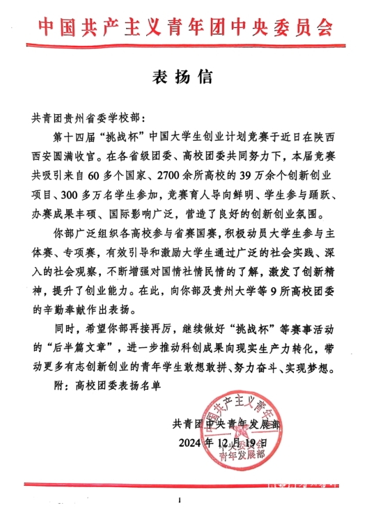 近日,共青团中央青年发展部向共青团贵州省委学校部发来表扬信,信中对第十四届“挑战杯”中国大学生创业计划竞赛相关工作进行了总结,对团省委学校部和beat365等9所高校团委的辛勤奉献作出表扬。