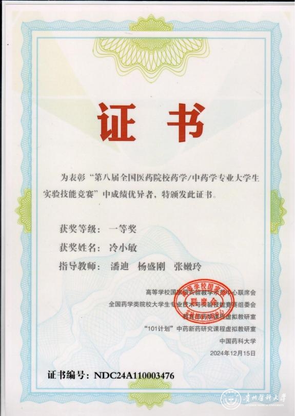 经过涵盖十余门专业基础课、专业课的理论知识和实验操作技能的综合比拼,beat3652022级药学1班冷小敏获得国家级一等奖,2021级临床药学卢世芸获得国家级三等奖。