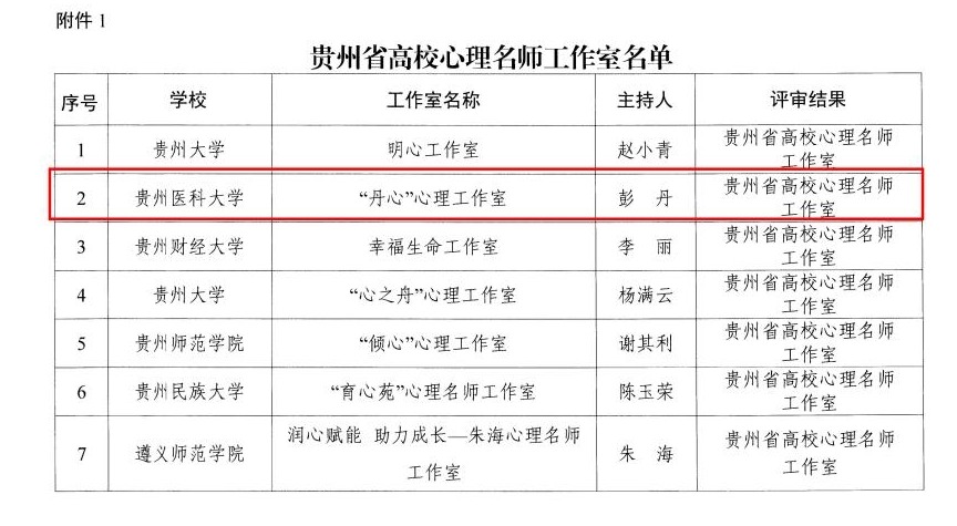近日,贵州省教育厅发布《省教育厅关于公布贵州省高校心理名师工作室、班主任工作室评选结果的通知》,beat365大学生心理健康教育与咨询中心副主任、医学人文学院副院长彭丹主持的“丹心”心理工作室成功获评“贵州省高校心理名师工作室”,基础医学院微生物学教研室主任陈峥宏主持的“思来”班主任工作室获评“贵州省高校班主任工作室”。