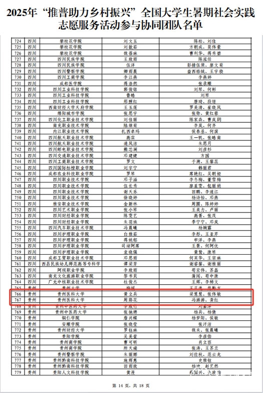 2025年“推普助力乡村振兴”全国大学生暑期社会实践志愿服务活动,吸引了全国1680所高校的8013支团队、8万余名师生踊跃报名。校团委、教务处高度重视和精心组织,紧密围绕活动主题和要求,提前策划、广泛动员、精准指导、严格遴选,共推荐10个团队参与申报。各申报团队充分结合医学专业特色和贵州乡村实际需求,精心打磨实践方案,深入挖掘服务潜力,展现了贵医学子服务国家战略的强烈意愿和扎实的专业素养。4个团队的成功入围充分彰显了学校在服务国家战略、引导青年实践育人方面的成效,是贵医学子社会责任感和实践能力的生动体现。