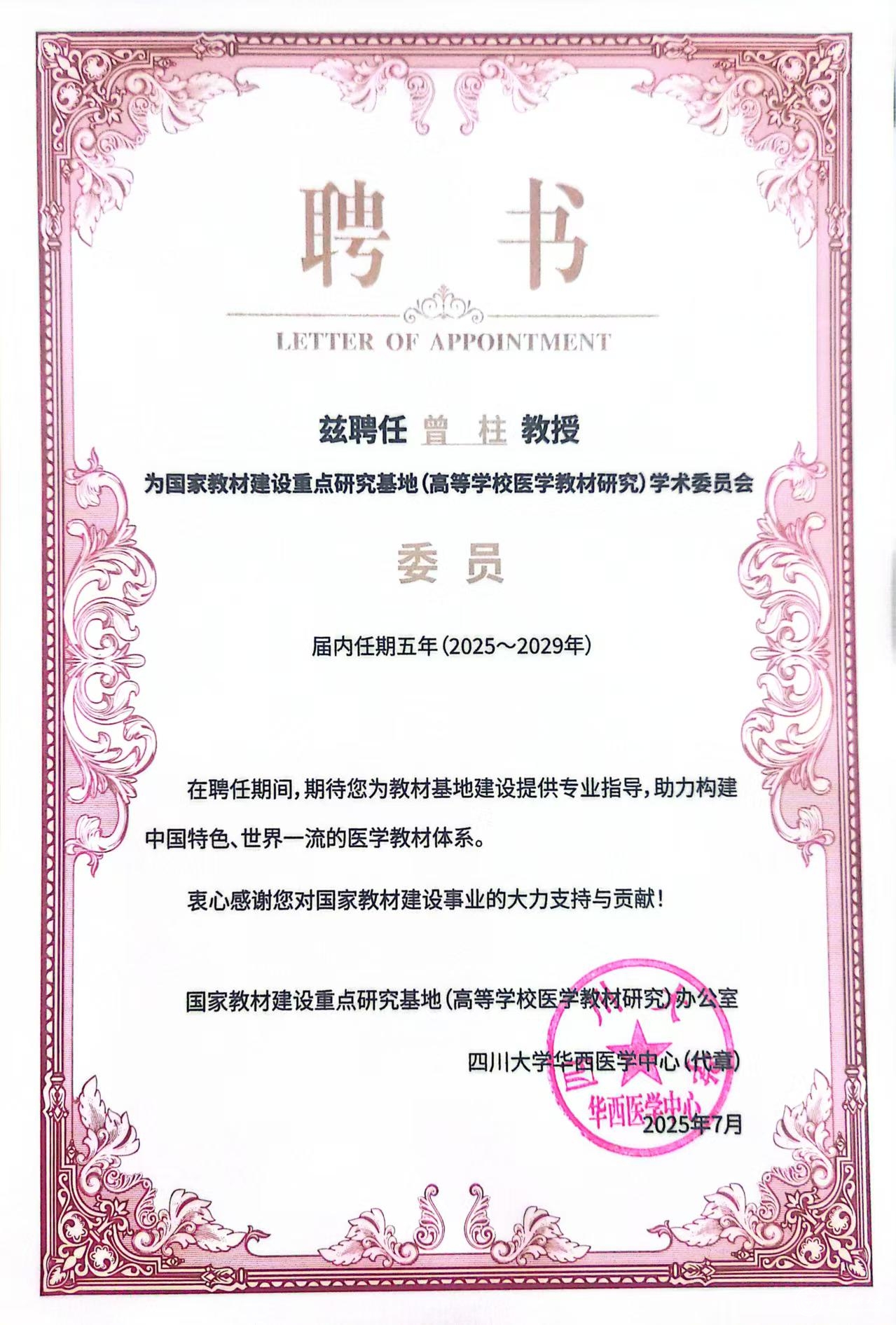 本次会议聚焦医学教材建设前沿方向,设置开幕式、主旨报告、教材建设专题研讨及圆桌交流等环节,旨在凝聚行业共识,推动医学教材体系创新发展。会议期间,国家教材建设重点研究基地(高等学校医学教材研究)学术委员会正式成立,并举行聘任仪式,曾柱受邀担任该委员会委员。