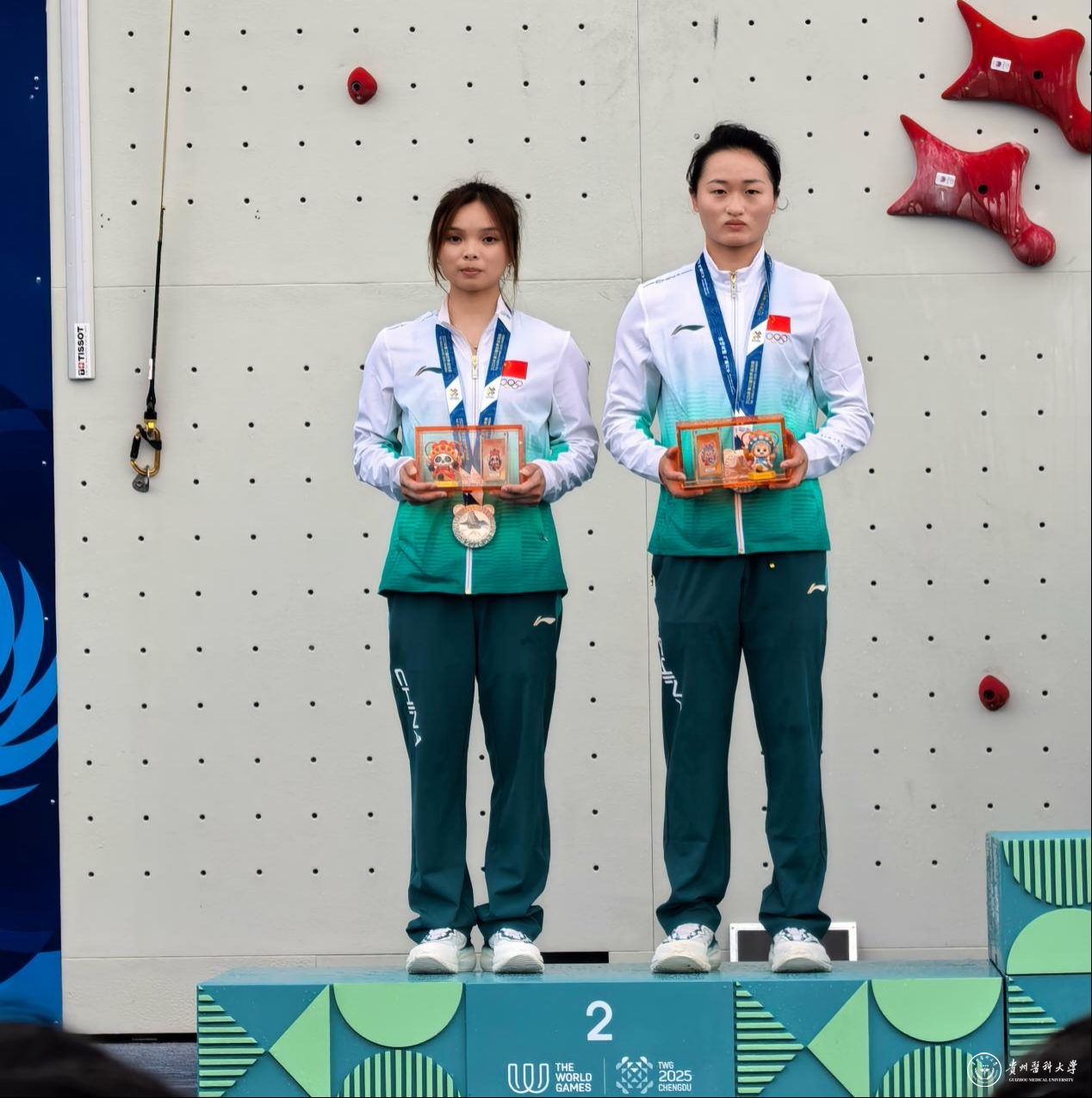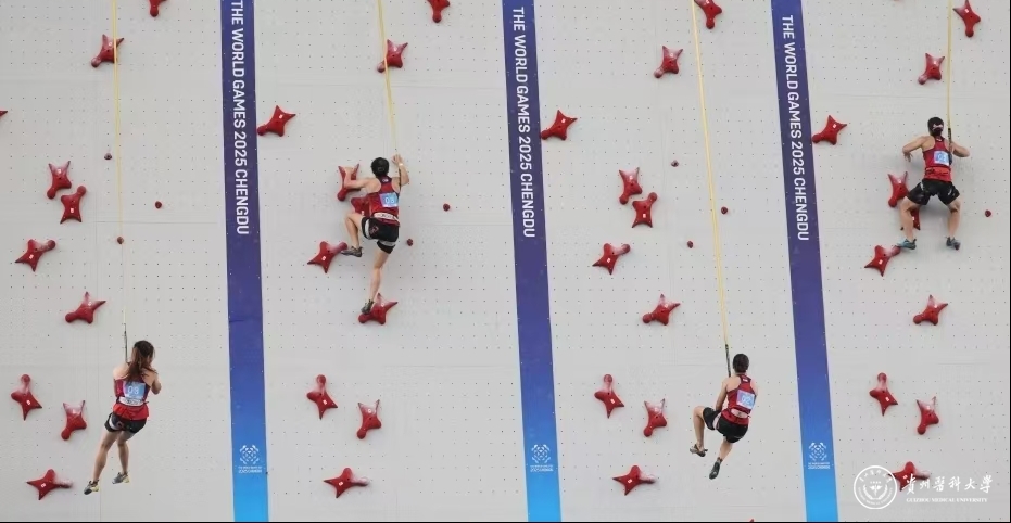 8月16日,在成都天府公园举行的第十二届世界运动会攀岩比赛最后一个比赛日,贵医学子张少琴与队友覃于妹默契配合,在双人女子攀岩速度接力赛中奋勇拼搏,最终以13秒76的成绩斩获亚军,为中国代表团再添一枚宝贵奖牌,也为学校争得了荣誉。