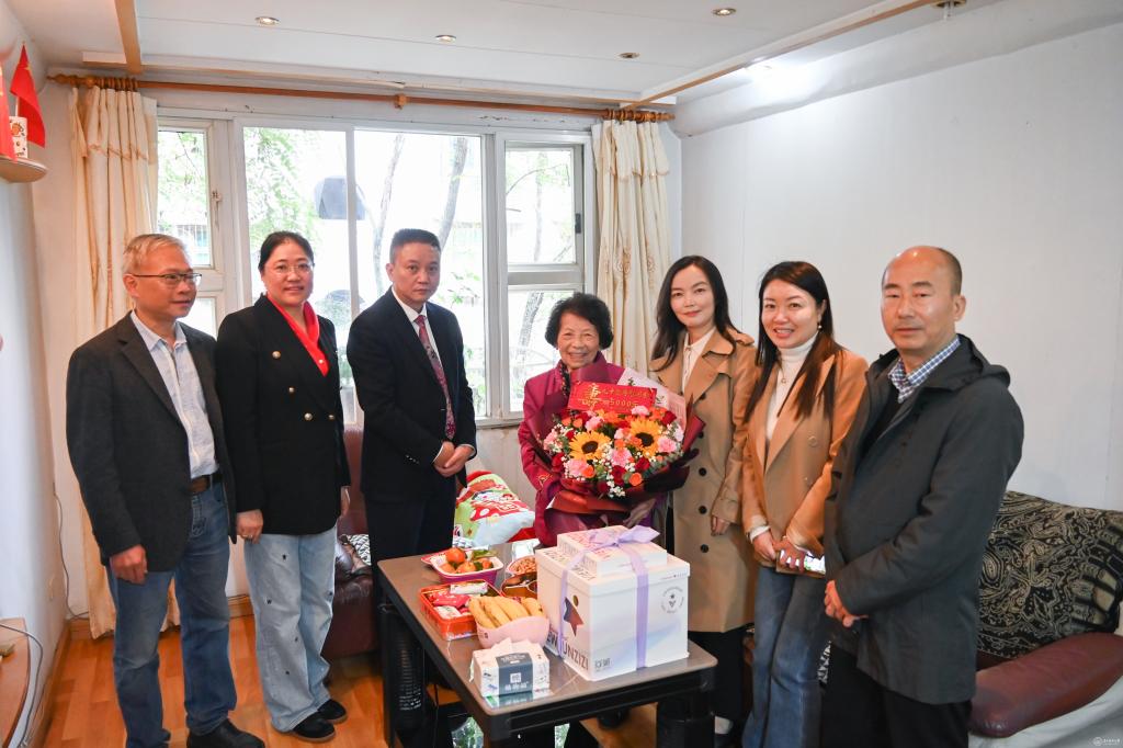 校领导依次为满70 岁、80 岁、90 岁的老同志代表送上鲜花、生日慰问金与蛋糕。慰问过程中,校领导关切询问老同志生活起居与健康状况,为老同志代表发放“重阳节”慰问品,将关怀与温暖送到老同志手中。老同志们满怀感动,纷纷表达对学校的感激之情。