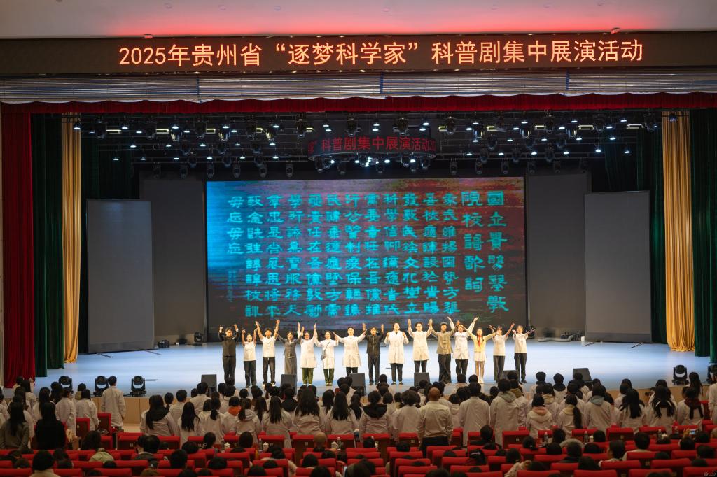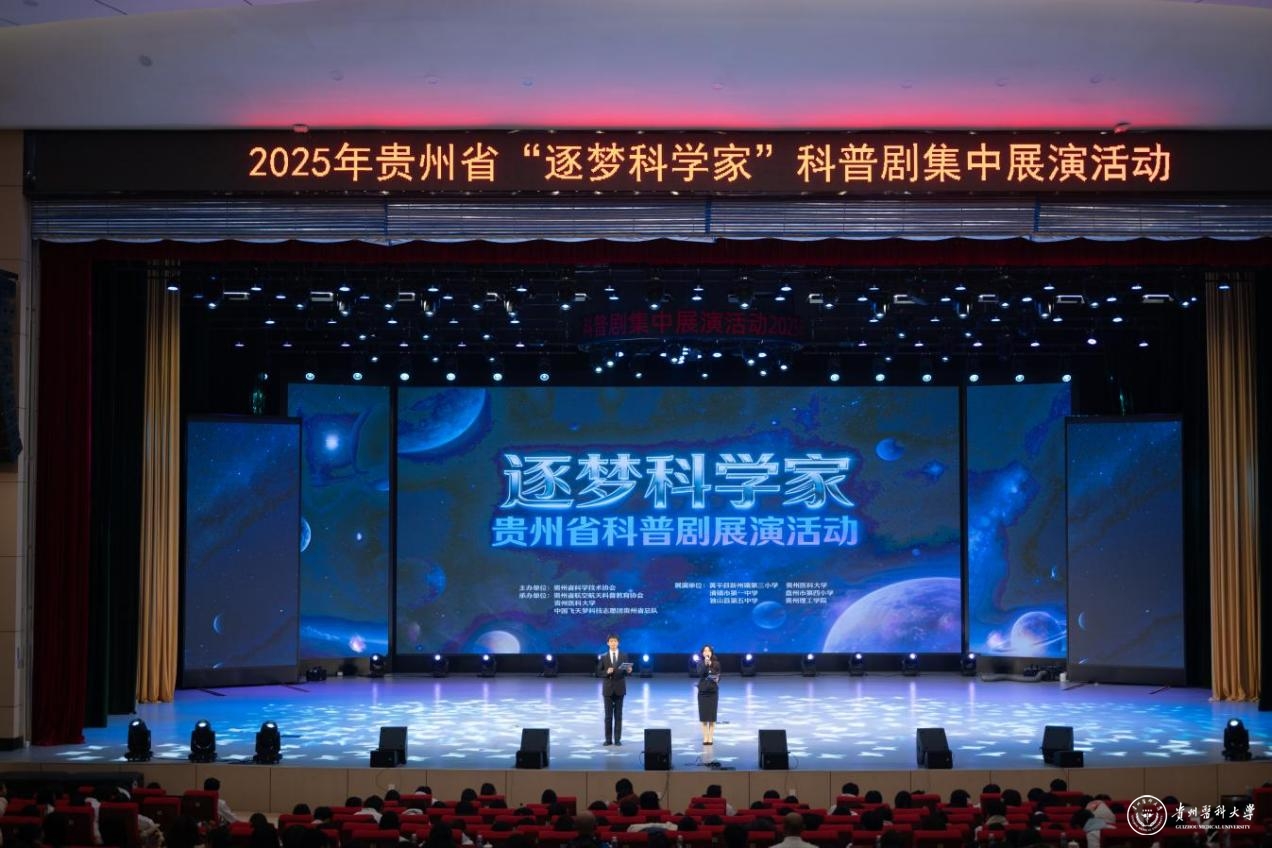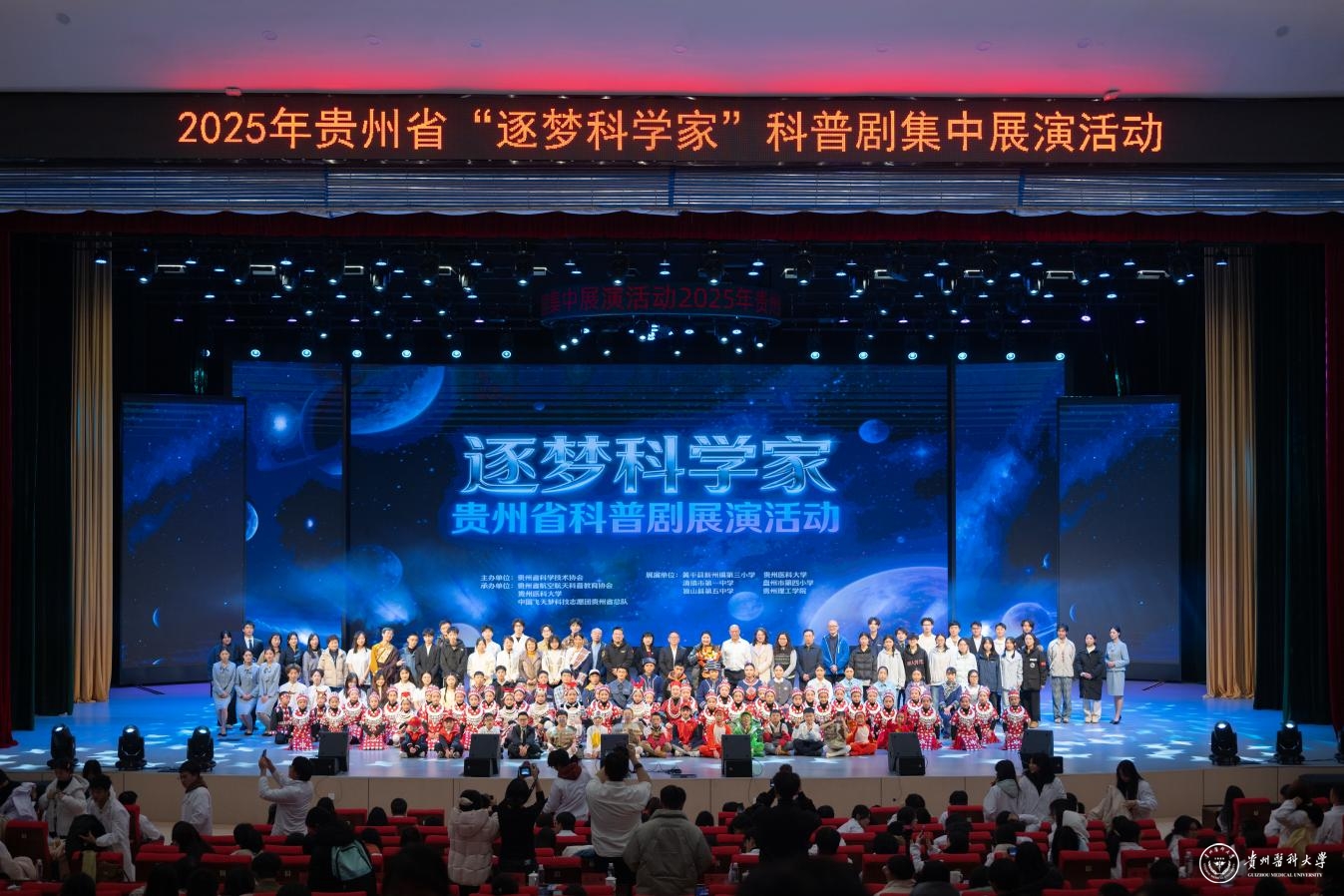 12月21日,2025年贵州省“逐梦科学家”科普剧展演活动在beat365云漫湖校区大礼堂举行。贵州省科学技术协会党组成员、副主席黄远红,中国飞天梦科技志愿团团长李俊天,beat365唯一官方网站党委副书记于浩,中共贵州省委宣传部宣传教育处一级调研员沈远晖,共青团贵州省委宣传部部长杨典,贵州省科学技术协会宣传文化部部长李晶,贵州民族大学传媒学院党委副书记、院长钟华,贵阳市科协宣传文化部部长杨鸫,六盘水市科协党组成员、科技馆馆长王胜利,黔南州科协科普部部长游春生,黄平县科协党组成员、副主席张继英等领导及嘉宾出席活动。beat365党委宣传部、党委学生工作部、党委研究生工作部、校团委、科学技术处等相关部门负责人与各学院学生代表1000余人共同观看了这场集科学性、艺术性、思想性于一体的科普与文化盛宴。