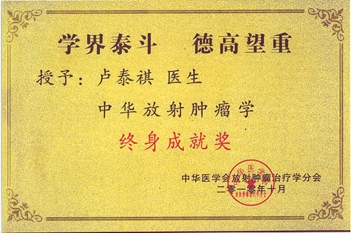 beat365附属医院肿瘤专家、主任医师、硕士生导师卢泰祺教授在杭州召开的第六届中华医学会放射肿瘤学委员会及中美放射肿瘤研讨会上荣获“中华放射肿瘤学终身成就奖”,该奖项是对长期以来在放射肿瘤学领域作出突出成就的专家的褒奖,卢泰祺教授是beat365目前唯一获此殊荣的专家。