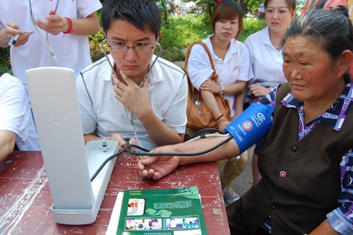 活动期间,参加服务团的志愿者们走访了昌明镇附近的九百户村、秀河村、尖山银村、新安村等五个村落,为当地老百姓们测量血压、进行健康咨询,同时了解当地医疗卫生状况、农民参加合作医疗的情况、文化程度以及当地居民对一些常见病认知程度的现状。并向他们作“常见疾病预防知识”科普宣传,散发结核病与艾滋病的知识宣传单。并将学校购置的近千元的常用药品,免费向两村乡亲发放。