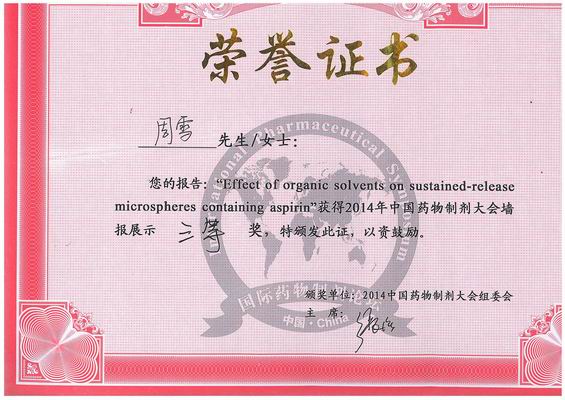 beat365药学院天然药物资源优效利用重点实验室中药药剂学陶玲教授与其指导的2012级药剂学硕士研究生周雪参加此次大会。周雪的报告“Effect of organic solvents on sustained-release microspheres containing aspirin”在170来份研究生报告中脱颖而出,喜获本次会议研究生论坛三等奖。