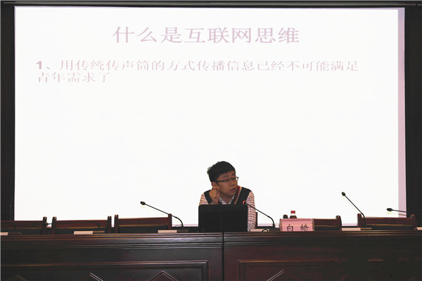 白皓老师围绕“什么是互联网思维”,以互联网思维的定义为开端,提出:新媒体时代没有权威,只有领袖;新媒体时代遮掩禁忌具有积极影响;新媒体时代与团员青年形成新社会关系与必须用OTO思维形成“协同共治”等一系列重要观点。并指出青年领袖要勇于在舆论场中亮剑。白皓老师睿智的谈吐,风趣的语言和深入浅出的讲解使参加培训的团干部和网络宣传员们就如何培养良好的思维以及怎样做一个会讲故事的团干部有了新的思考。