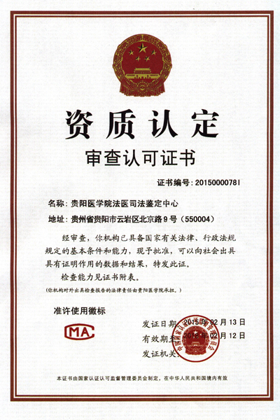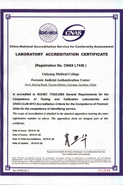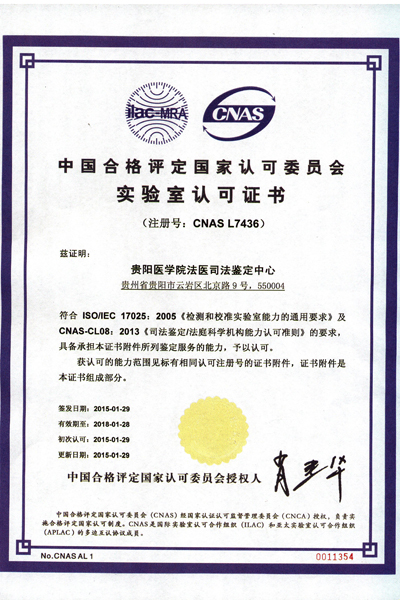 beat365法医司法鉴定中心于2014年12月正式通过中国合格评定国家认可委员会(CNAS)和国家认证认可监督管理委员会(CMA)专家组的现场评审并于近日取得相关证书(见附图),成为贵州省内第一家通过国家级(法医类)实验室和检查机构资质认定与认可的司法鉴定机构,认证认可范围包括法医病理学、法医临床学、法医物证学、法医毒物学四大类,准许向社会出具具有证明作用的(法医类检测和检查)数据和结果,准许在机构场所和鉴定文书上使用CNAS和CMA标识及徽章等。此项证书的获取表明beat365法医鉴定中心鉴定水平已达到全国司法鉴定领先水平。