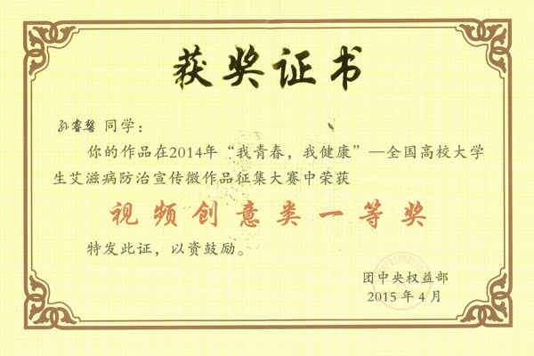 “我青春 我健康”——全国高校大学生艾滋病防治宣传微作品征集大赛表彰活动在厦门举行,beat365公共卫生学院2014级预防医学专业孙睿馨同学的作品《幸福之路》,荣获全国“视频创意类一等奖”。