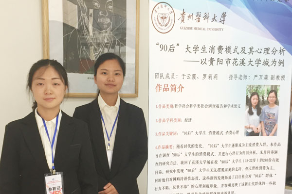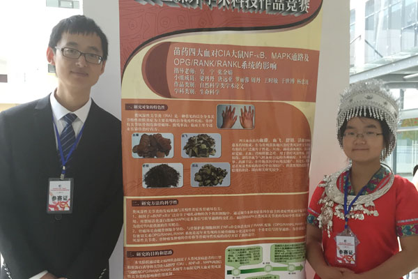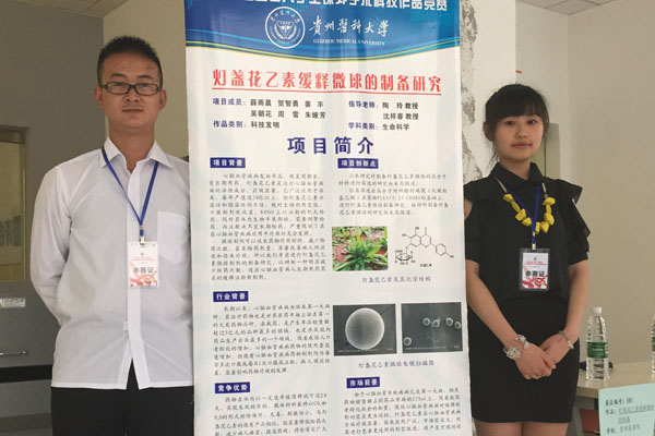 经过评委们的认真评审,beat365参赛的4件作品全部获奖。其中,2011级医学生物技术夏雪等同学的作品《G蛋白与荧光蛋白在肝癌细胞中融合表达的研究》(指导老师:曾柱、胡祖权)荣获自然科学类一等奖;2012级临床医学梁丹丹等同学的作品《探究苗药四大血对CIA大鼠NF-KB、MAPK通路及OPG/RANK/RANKL系统的影响》(指导老师:吴宁、张金娟)荣获自然科学类二等奖;2014级药剂学研究生薛雨晨等同学的作品《制备灯盏花乙素微球的最佳高分子材料筛选的方法》(指导老师:陶玲、沈祥春)荣获科技发明制作类二等奖;2014级应用心理学于云霞等同学的作品《“90后”大学生消费模式及其心理学分析(以贵阳市花溪大学城为例)》(指导老师:严万森)荣获哲学社会科学类三等奖。