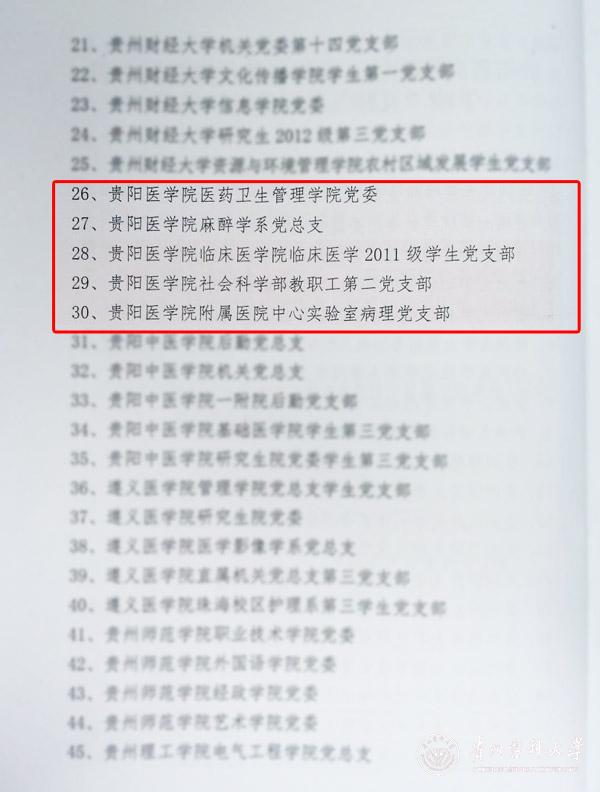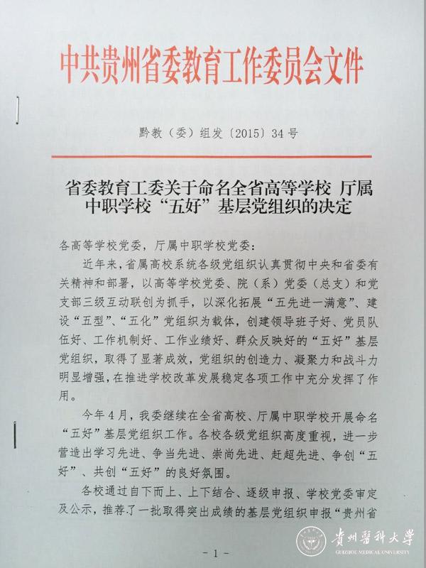 近日,省委教育工委下发了《关于命名全省高等学校厅属中职学校“五好”基层党组织的决定》(黔教(委)组发〔2015〕34号),命名表彰了一批全省高校“五好”基层党组织。beat365医药卫生管理学院党委、麻醉学系党总支、临床医学院临床医学2011级学生党支部、社会科学部教职工第二党支部、附属医院中心实验室病理党支部等5个基层党组织荣获全省高校“五好”基层党组织称号。