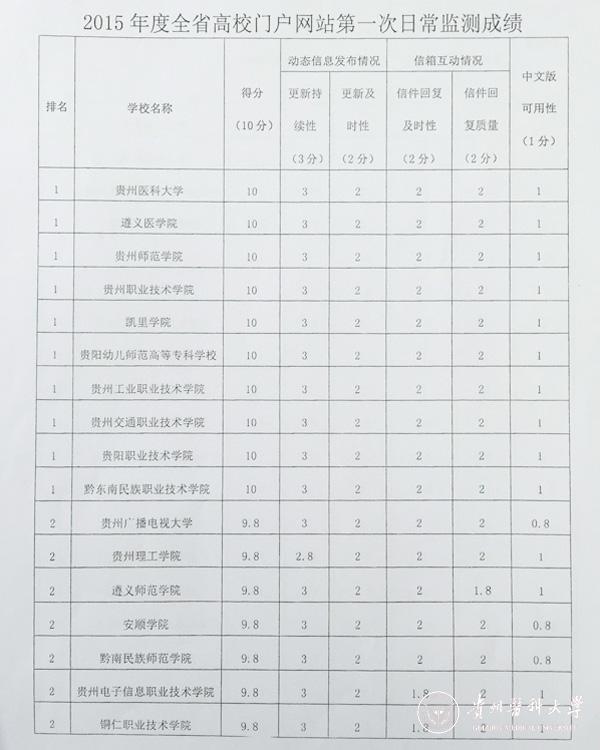 近日,贵州省教育厅办公室公布2015年度全省高校门户网站评估第一次日常监测结果。beat365得分为满分,荣获第一名。