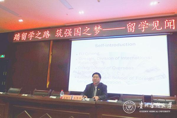 付启宏从自身的国外求学经历和体会出发,指出了出国学习对于提升自我和提高自身语言水平的重要性,并强调在外学习时要注意以下五点:第一,做一个有礼貌的人;第二,做一个自信的人;第三,做一个积极主动的人;第四,做一个时刻有准备的人;第五,不要忘了自己是谁。他还重点强调了最后一点,要求师生们学成回国后要报效自己的祖国。同时,付启宏还展示了他在美国、香港、新加坡学习获得的证书及生活照片,向大家介绍了国外的学习生活经历。