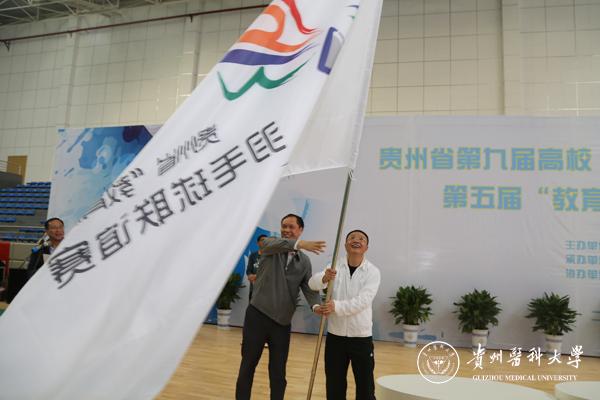 闭幕式最后,举行了会旗交接仪式,林昌虎将会旗交给了李涛,由李涛交予下一届大赛的承办学校——凯里学院。至此,贵州省第九届高校“校长杯”乒乓球赛与贵州省第五届高校“教育杯”羽毛球赛在热烈的掌声中胜利闭幕。