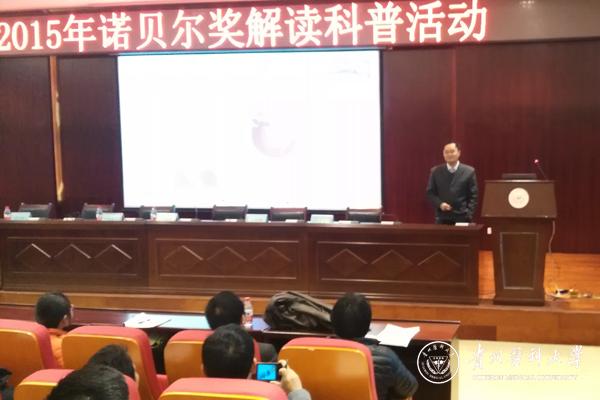 12月8日下午,由中国细胞生物学学会主办、贵州省细胞生物学学会及beat365共同承办的“2015年诺贝尔奖解读科普讲座”在南校区道德讲堂举行,参加此次科普讲座的有本校在读研究生、学校老师及贵州省细胞生物学学会部分会员。讲座由贵州省细胞生物学学会副理事长梁建东主持。