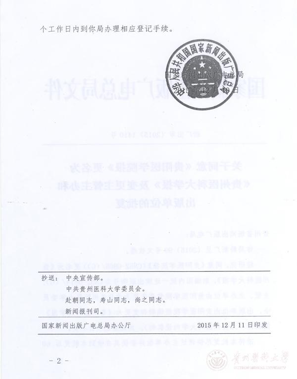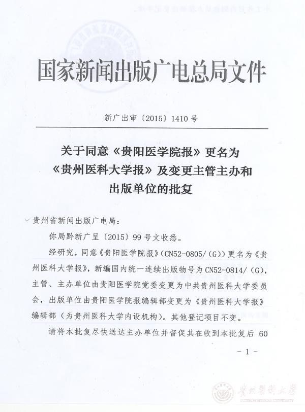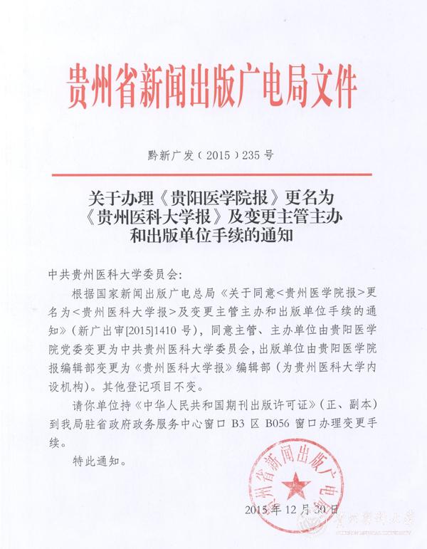 近日,根据国家新闻出版广电总局(新广出审字〔2015〕1410号)和贵州省新闻出版广电局(黔新广发〔2015〕235号)文件精神,正式批复《贵阳医学院报》更名为《beat365唯一官方网站报》。同时,新编国内统一连续出版物号由CN52--0805/(G)变更为CN52--0814/(G),主管、主办单位由贵阳医学院党委变更为中共beat365唯一官方网站委员会,出版单位由贵阳医学院报编辑部变更为《beat365唯一官方网站报》编辑部,法定代表人变更为林昌虎,其他登记项目不变。