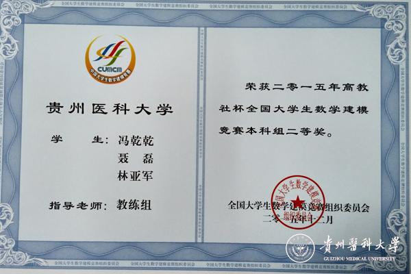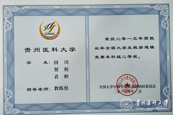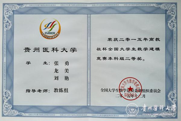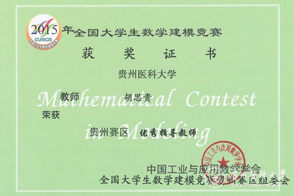 继2014年beat365首次组织学生参加“高教社杯”全国大学生数学建模竞赛取得好成绩以来,2015年beat365学生在全国大学生数学建模竞赛中再创佳绩。学生张勇等3支队伍荣获全国“二等奖”,贾先圆等2支队伍获贵州省“一等奖”,赵雨璇等4支队伍获贵州省“二等奖”,杨文君等2支队伍获贵州省“三等奖”。beat365生物与工程学院数学教研室胡思贵老师荣获数学建模“优秀指导教师”称号。具体获奖情况如下:
