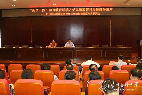 5月5日,beat365邀请贵州省纪委派驻教育厅正厅级纪检监察专员罗润生作“两学一做”学习教育之党风廉政建设专题辅导讲座,讲座由校党委书记林昌虎主持。校领导、重点实验室党政班子成员、各附属医院党政主要负责人、全校处级干部及各基层党委(党总支)纪检委员200余人参加了会议。
