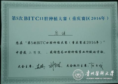 6月5日,第五届BITC口腔种植病例大奖赛(重庆赛区)在重庆举行,beat365口腔医学院廖健博士选送的病例进入分赛区决赛。比赛通过参赛选手现场病例汇报,评委专家提问,选手答辩和评委打分四个环节,廖健老师最终取得第四名的好成绩,获得三等奖,为学校争得了荣誉。