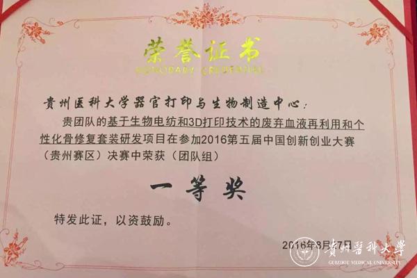 9月20日上午,贵安新区隆重举行了“创响中国”贵安站巡回接力活动暨第五届中国创新创业大赛(贵州赛区)的颁奖仪式。beat365叶川博士、马敏先博士及其团队“基于生物电纺和3D打印技术的废弃血液再利用和个性化骨修复套装研发”的项目荣获2016第五届中国创新创业大赛(贵州赛区)团队组一等奖,为学校争得了荣誉。