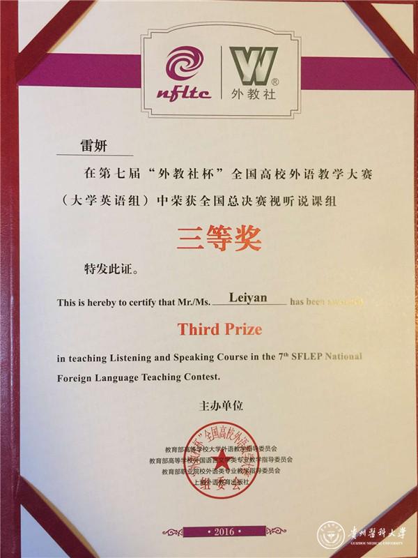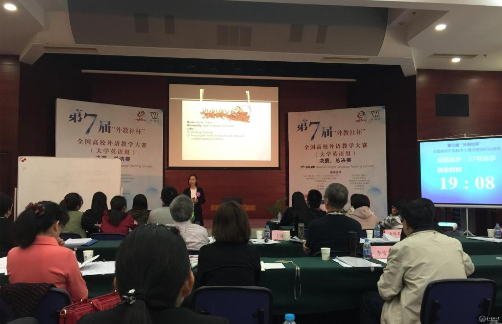 由教育部高等学校大学外语教学指导委员会、教育部高等学校外国语言文学类专业教学指导委员会和教育部职业院校外语类专业教学指导委员会、上海外语教育出版社主办的第七届“外教社杯”全国高校外语教学大赛(大学英语组决赛)于11月6-7日在上海外语教育出版社举行,大赛分为读写组和视听说组。beat365外国语学院雷妍老师作为6月举行的贵州赛区决赛视听说组特等奖获得者代表贵州参加本次全国决赛的视听说组比赛。29名来自全国的教师参加了本次视听说组的比赛。经过2天激烈的讲课和说课比赛,最终雷妍老师获得视听说组三等奖。 这是beat365唯一官方网站英语老师首次站在全国的竞赛舞台上,不仅展示了beat365英语教师的实力和风采,而且也是一次很好宣传beat365唯一官方网站的机会。
