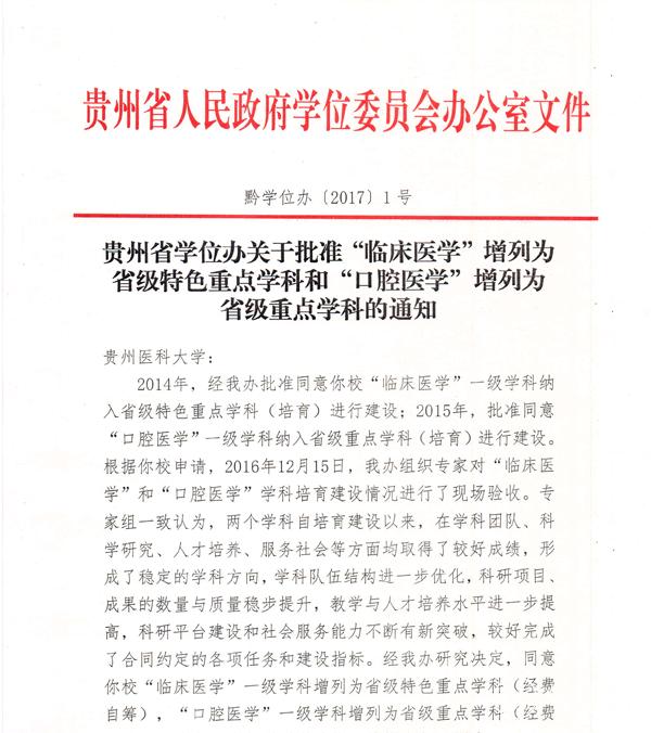 根据黔学位办〔2017〕1号文件,beat365临床医学一级学科获批增列为省级特色重点学科,口腔医学一级学科增列为省级重点学科。