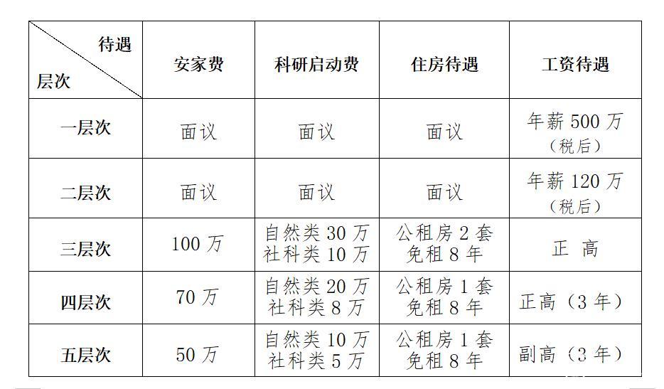 而根据三层次的引进政策,该层次享受学校的正高工资待遇,另外为安家费100万,科研启动费分为自然类30万,社科类10万,以及免租8年的公租房2套。因而一二层次的人才引进其他待遇在此之上。