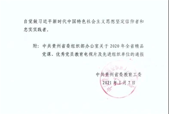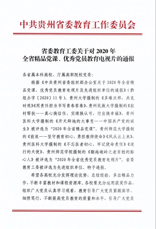 近日,中共贵州省委组织部下发文件,对2020年全省精品党课、优秀党员教育电视片及先进组织单位进行了通报。由beat365唯一官方网站摄制并选送的视频《开天辟地的大事变——中国共产党的诞生》被评为2020年全省精品党课;《不忘医者初心,牢记使命责任》、《逆行的天使》被评为2020年全省优秀党员教育电视片。
