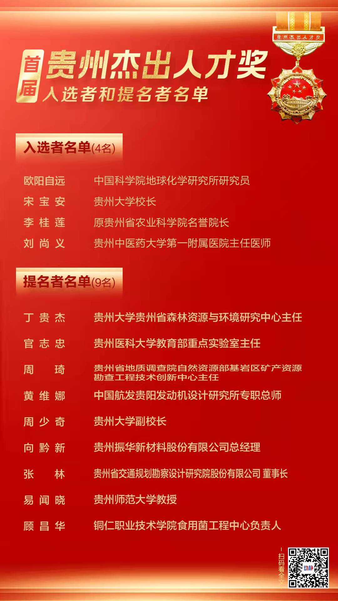 在服务保障全省经济社会发展的生动实践中,涌现出了一批锐意创新、勇于担当、拼搏奉献、实绩突出的杰出人才,他们在推进脱贫攻坚、疫情防控、经济社会高质量发展等重点任务和重大工作中取得了优异成绩,是我省各行业、各领域人才的优秀代表。为表彰他们所作的突出贡献,在全社会营造识才、爱才、敬才、用才的良好环境,持续释放我省全方位引才、育才、用才的强烈信号,进一步激发全省广大人才积极投身经济社会高质量发展的主动性创造性,省委、省政府决定,授予欧阳自远等4人“贵州杰出人才奖”;授予丁贵杰等9人“贵州杰出人才奖”提名奖。