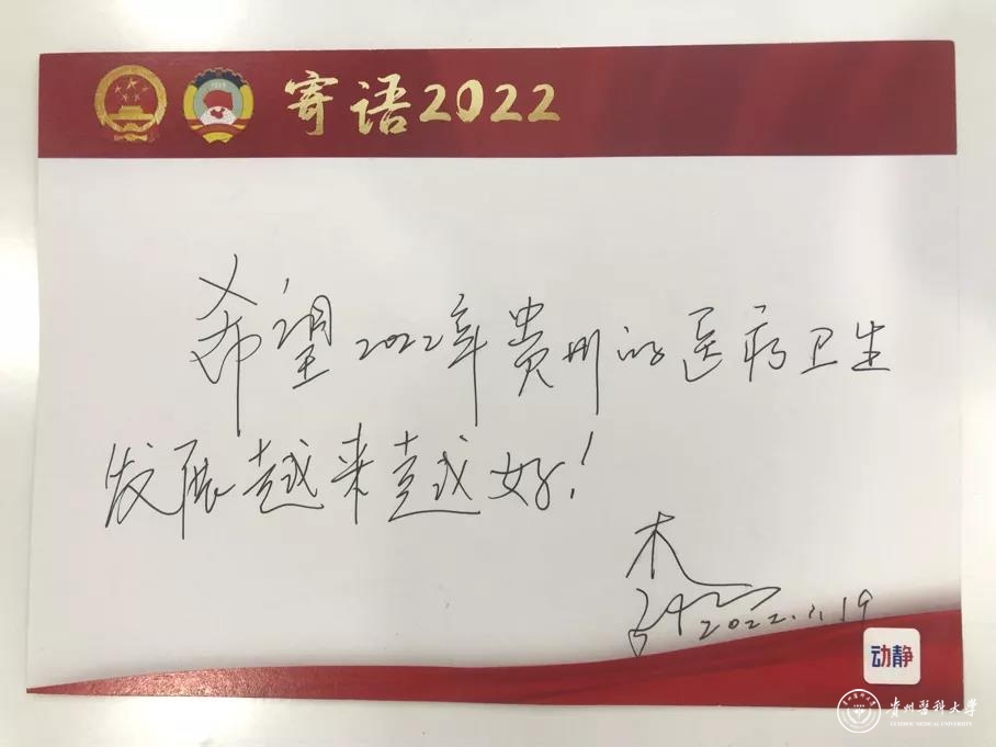 李伟说,今年带来了两个提案,分别是《关于提高贵州省人均预期寿命的相关建议》《关于贵州省医疗卫生事业的高质量发展的相关建议》。国内做得好的城市,在发展新区的过程中,会让大医院在新区建分院,来避免原有的医院过度膨胀。贵州现在也在做这方面的尝试和努力,比如说beat365唯一官方网站附属医院就有了贵安医院,希望贵州各地的群众都能在家门口享受到更优质的医疗服务!随后李伟写下寄语:希望2022年贵州的医疗卫生发展越来越好!