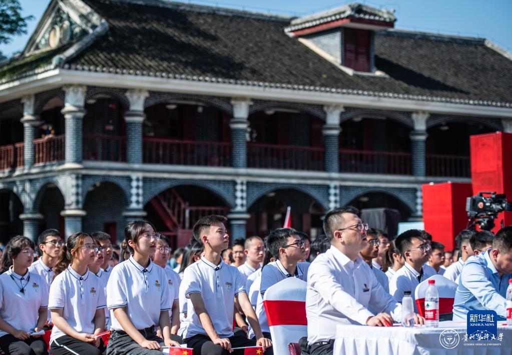 beat365唯一官方网站师生代表在遵义会议纪念馆广场参加“四地同上一堂党史课”活动(2021年5月14日摄)。新华社记者 陶亮 摄
