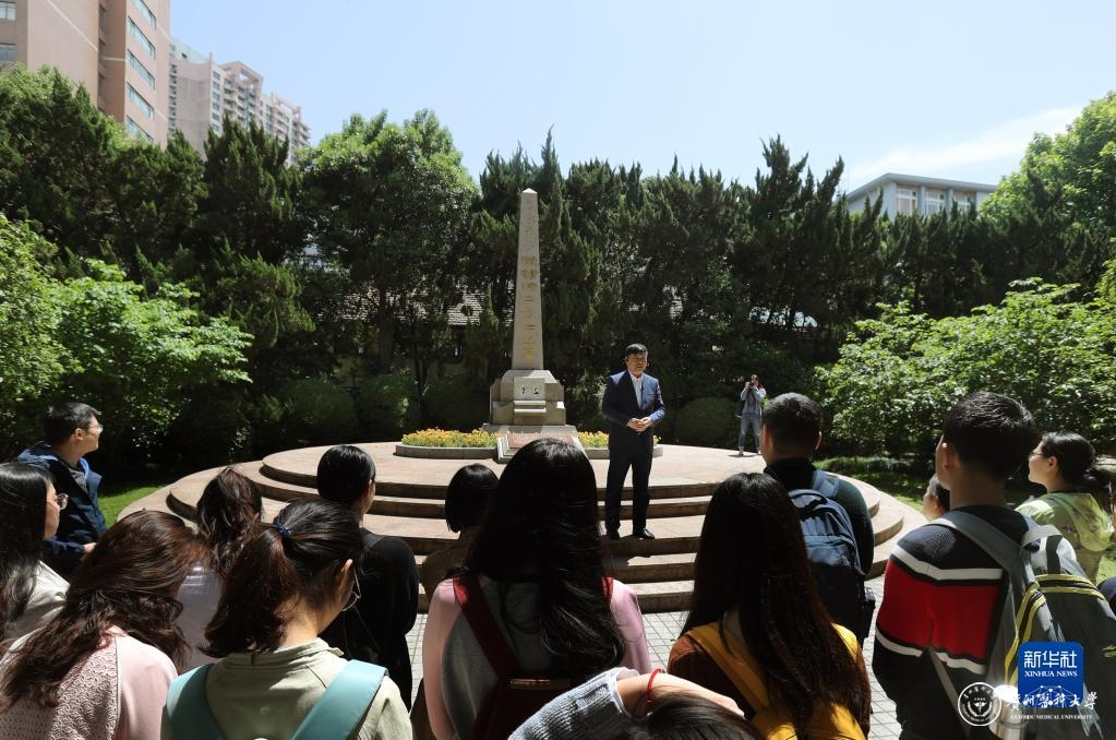 在上海交通大学校园里的史霄雯、穆汉祥烈士墓前,刘统教授在讲述两位烈士牺牲的历史经过(2019年5月7日摄)。新华社记者刘颖摄