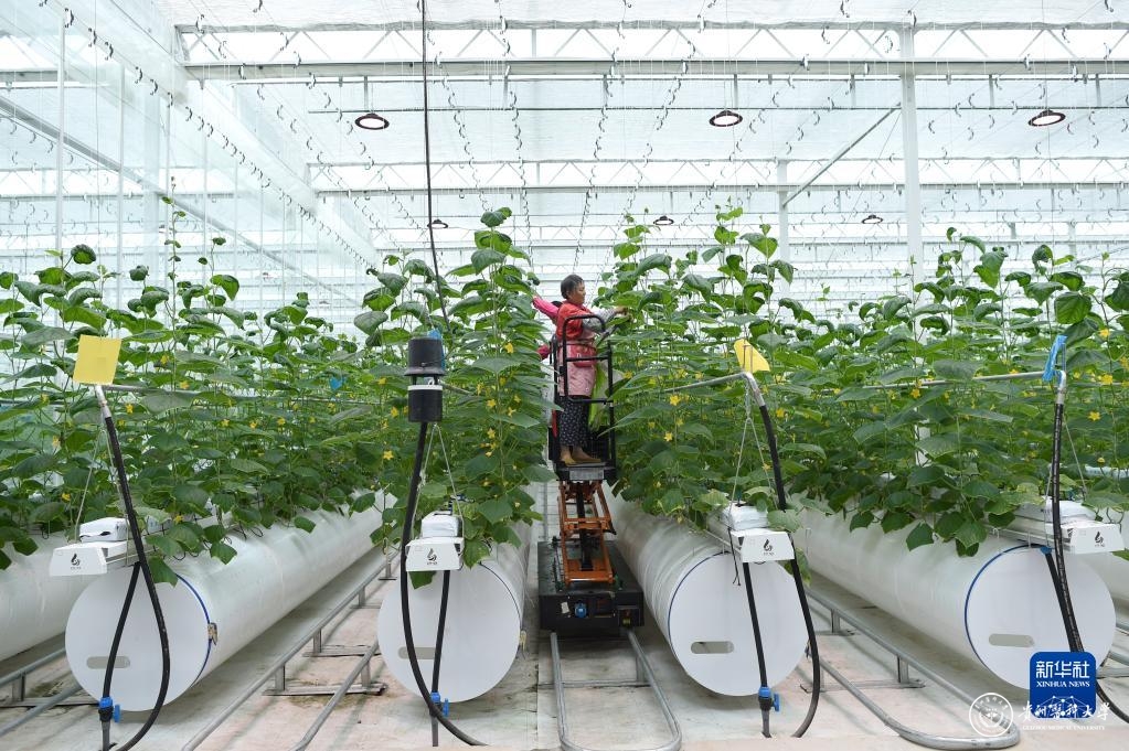 9月16日,工作人员在浙江省嘉兴市一家农业数字化工厂的种植车间内乘轨道升降车对蔬菜进行日常管理。新华社记者 韩传号 摄