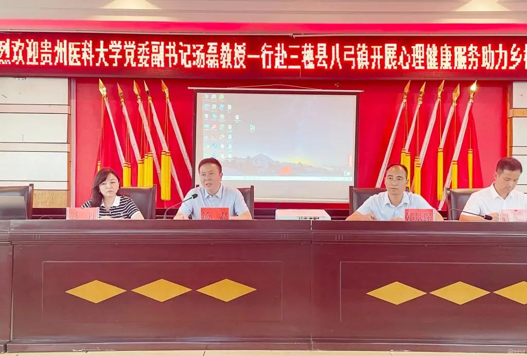 此外,汤磊一行还前往三穗县八弓镇,同八弓镇党委书记韩景宝,八弓镇党委副书记、镇长黄廷芳,八弓镇人大主席杨再萍等八弓镇政府干部代表召开心理健康服务助力乡村振兴活动推进会。会后,大学生心理健康教育与咨询中心副主任彭丹一行前往蜜蜂村开展留守儿童心理帮扶,建立八弓镇蜜蜂村留守儿童心理帮扶基地并挂牌,发放心理援助科普宣传资料等。