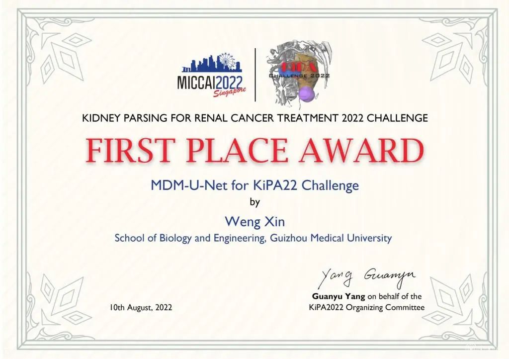 比赛获奖证书MICCAI是由国际医学图像计算和计算机辅助干预协会举办的综合性学术会议,目前被公认为是医学图像分析领域最具影响力的国际会议。KiPA22挑战赛旨在通过人工智能算法实现肾脏CTA(Computed Tomography Arteriography)图像上的肾脏、肾肿瘤、肾动脉和肾静脉的自动分割,其目的是实现有助于患者肾脏体积、肿瘤大小、肾动静脉的术前精准评价。