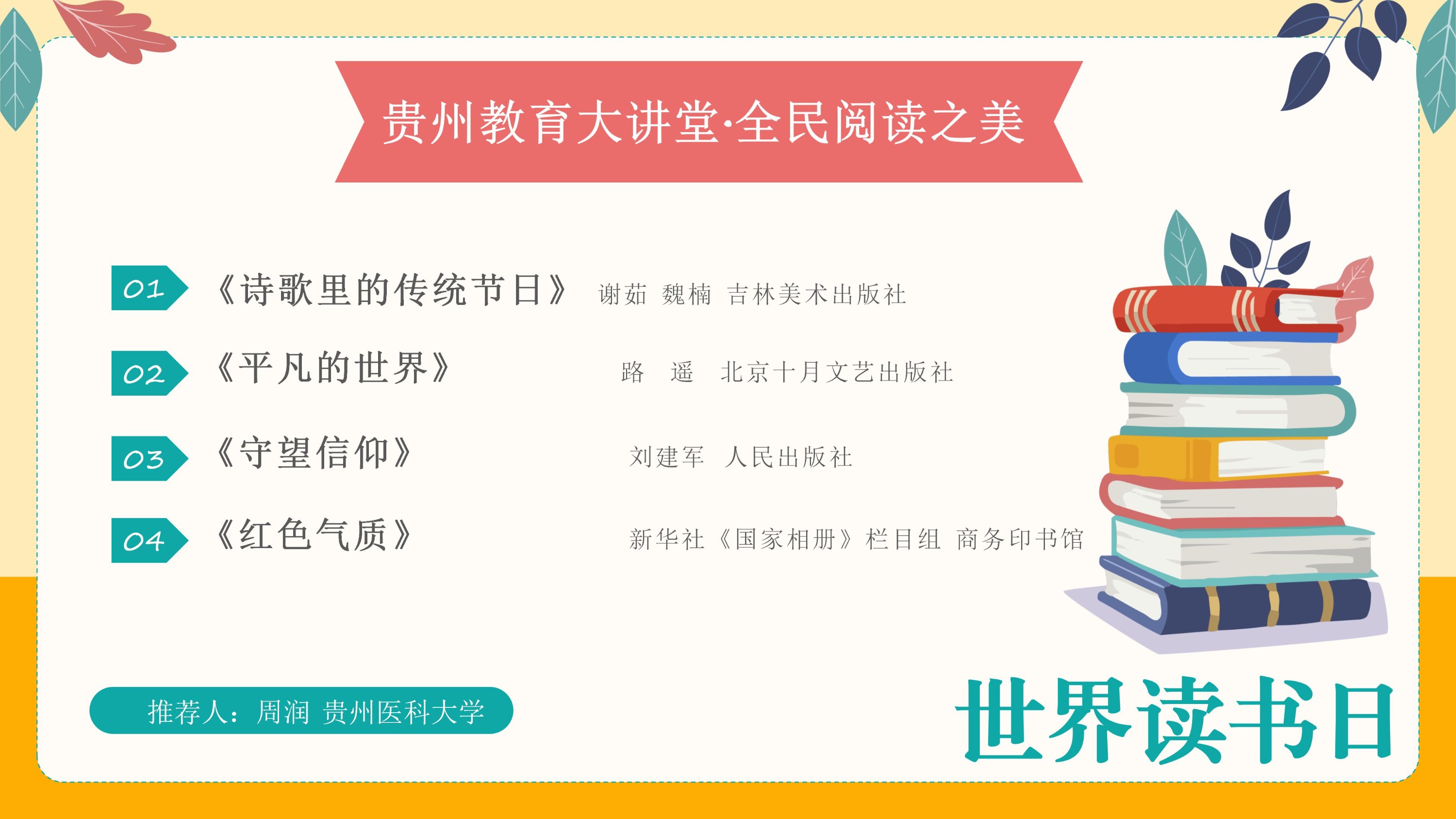 近日,《贵州教育大讲堂》第28个世界读书日特别节目《全民阅读之美》邀请周润同学作为嘉宾,参加了节目现场录制。在节目录制过程中,周润讲述了自己的阅读故事,畅谈读书心得,分享阅读经验,推荐优秀书籍,助力全省师生合理制定读书规划,多读书、读好书,感受书香之美、文化之美、阅读之美,在学习中汲取奋进的力量,补足精神之钙。