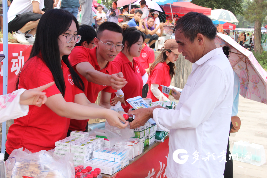 五寨村义诊现场,实践队员们将提前准备的药品、中草药香囊、医药保健科普手册分发给当地群众,并为他们测血压、讲解慢性病预防知识和常用药品的使用方法等。活动吸引了大量村民,尤其是中老年人,队员们耐心的讲解和细心的服务得到了当地村民们的认可。义诊现场,共计发放价值3500余元的药品、宣教手册300余册,服务3000余人次。