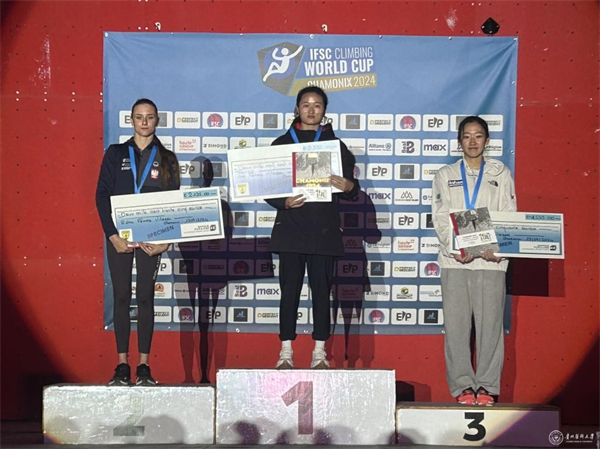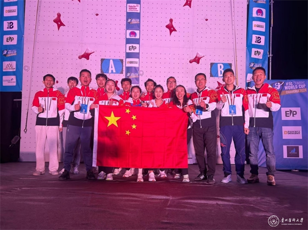 这是张少琴同学在第19届杭州亚运会上获得金牌后又一次在世界大赛上斩获金牌,也是贵州女子攀岩运动员获得的第一块攀岩世界杯金牌。为国家,为贵州,为贵医争得了荣誉。