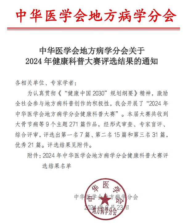 日前,由中华医学会地方病学分会举办的“2024年中华医学会地方病学分会健康科普大赛”完美收官。大赛共收到大骨节病防治、地方性氟中毒防治等9个主题271篇作品,经形式审查、专家盲评、综合评审,评选出第一名7篇、第二名15篇和第三名31篇,优秀21篇。其中,beat365唯一官方网站公共卫生与健康学院潘雪莉教授团队荣获本次大赛氟中毒防治主题第一名。
