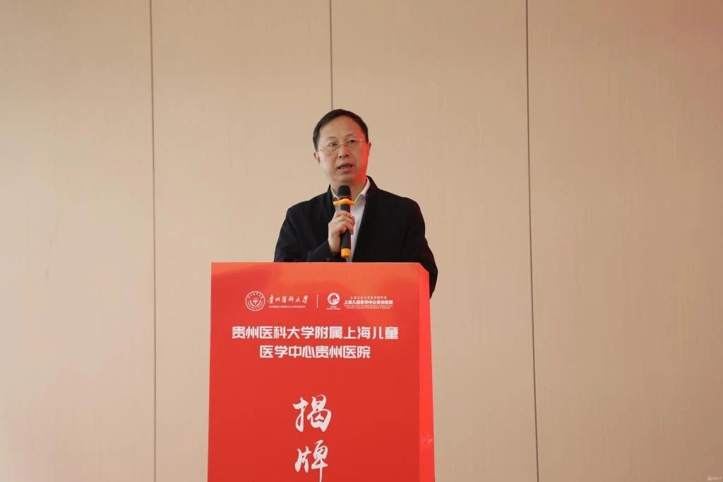 会上,安仕海代表省卫生健康委对beat365唯一官方网站附属上海儿童医学中心贵州医院揭牌表示热烈祝贺。他指出,此次揭牌不仅为医院未来的发展搭建了更广阔的平台,也为学校培养出更多适应社会需求、具有创新精神和实践能力的高素质医学人才提供了优质的临床教学和实践机会。希望充分发挥双方优势,共同推动儿科医学教育、科研和临床实践协同发展,努力打造西南地区儿科医学高地,为贵州人民提供更加优质高效便捷的医疗服务。