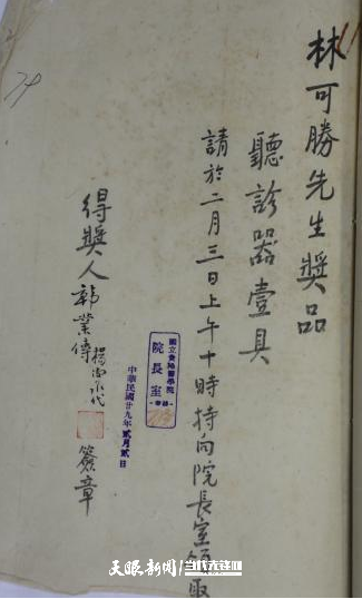 首届毕业生韩业传荣获林可胜先生赠送奖品