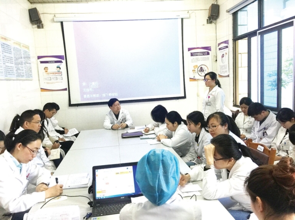 血液科医生们正在用英文进行晨会交班工作。