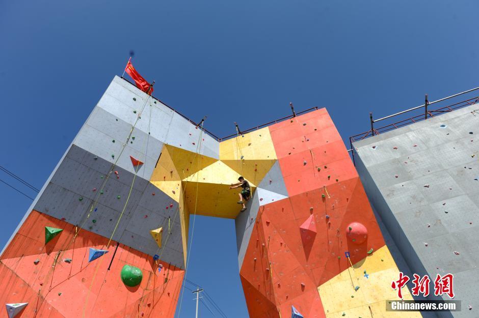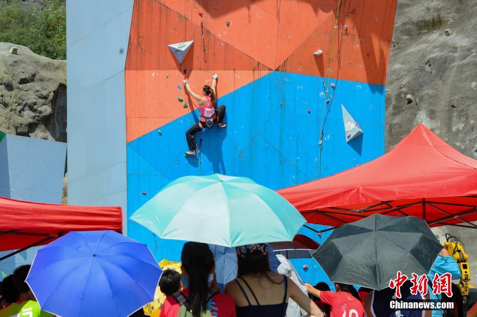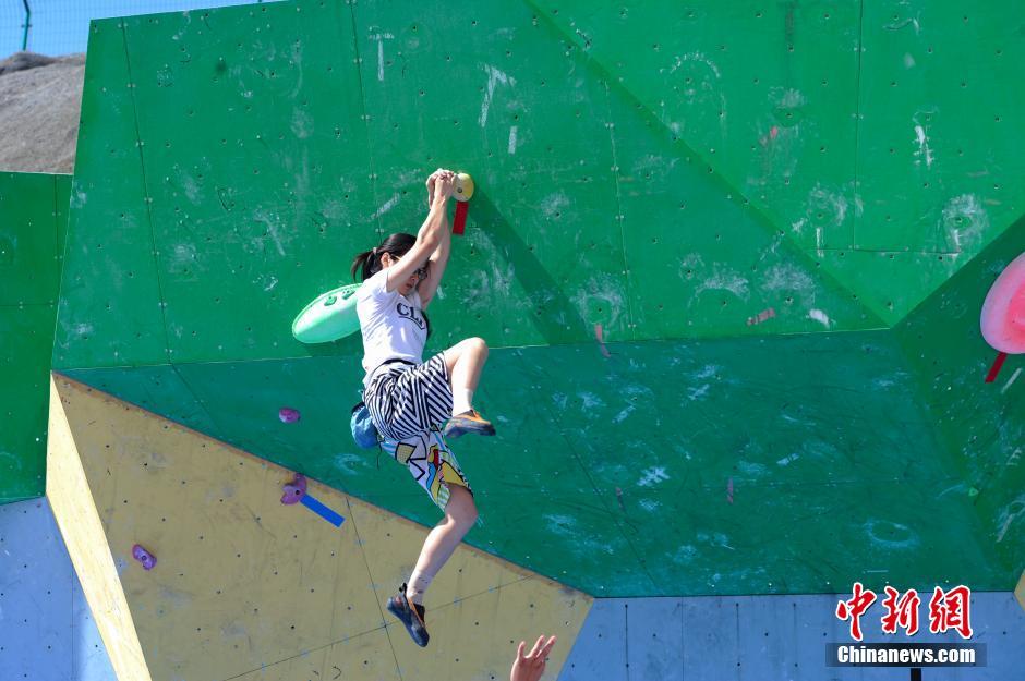 7月26日,一名女子组选手在攀石赛比赛中。当日,第十四届全国大学生攀岩锦标赛决赛在beat365唯一官方网站进行。本届攀岩锦标赛为期4天,包括速度赛、难度赛和攀石赛三个项目,来自澳门大学、北京大学、东华大学等50所高等院校316名运动员、118名领队和教练参赛。